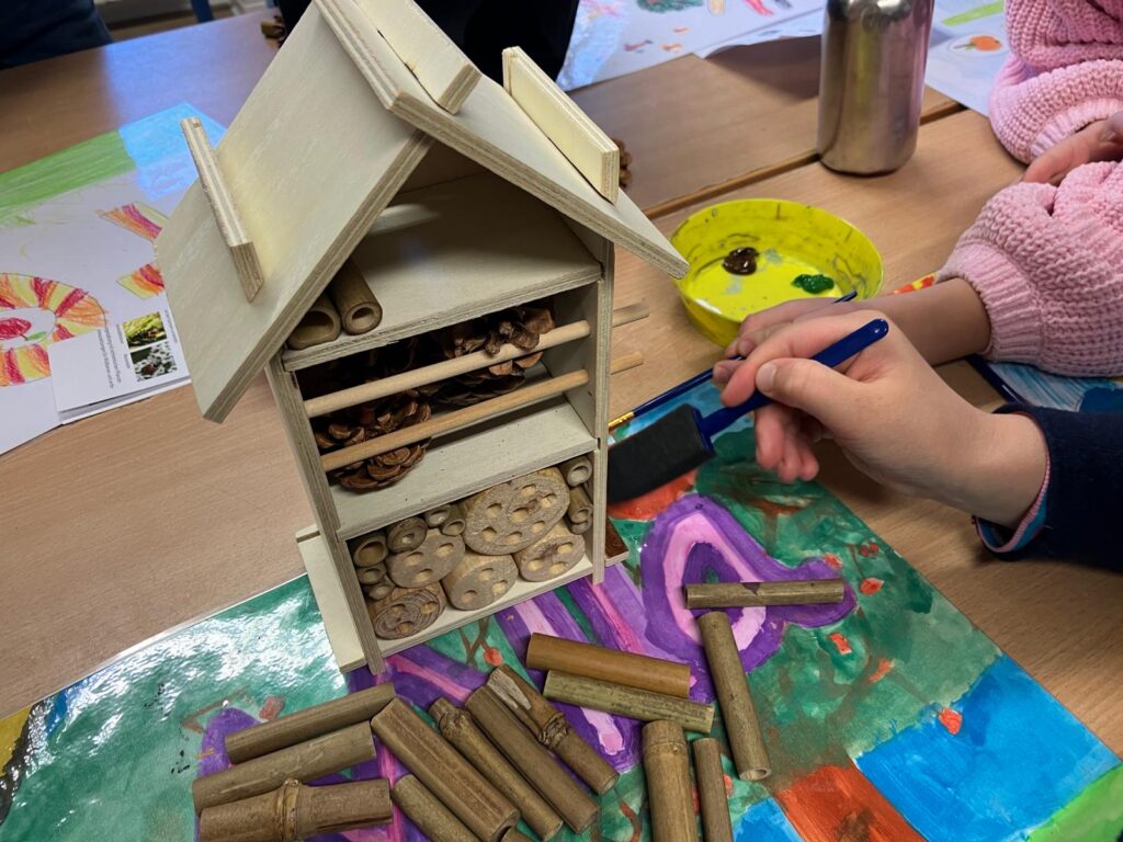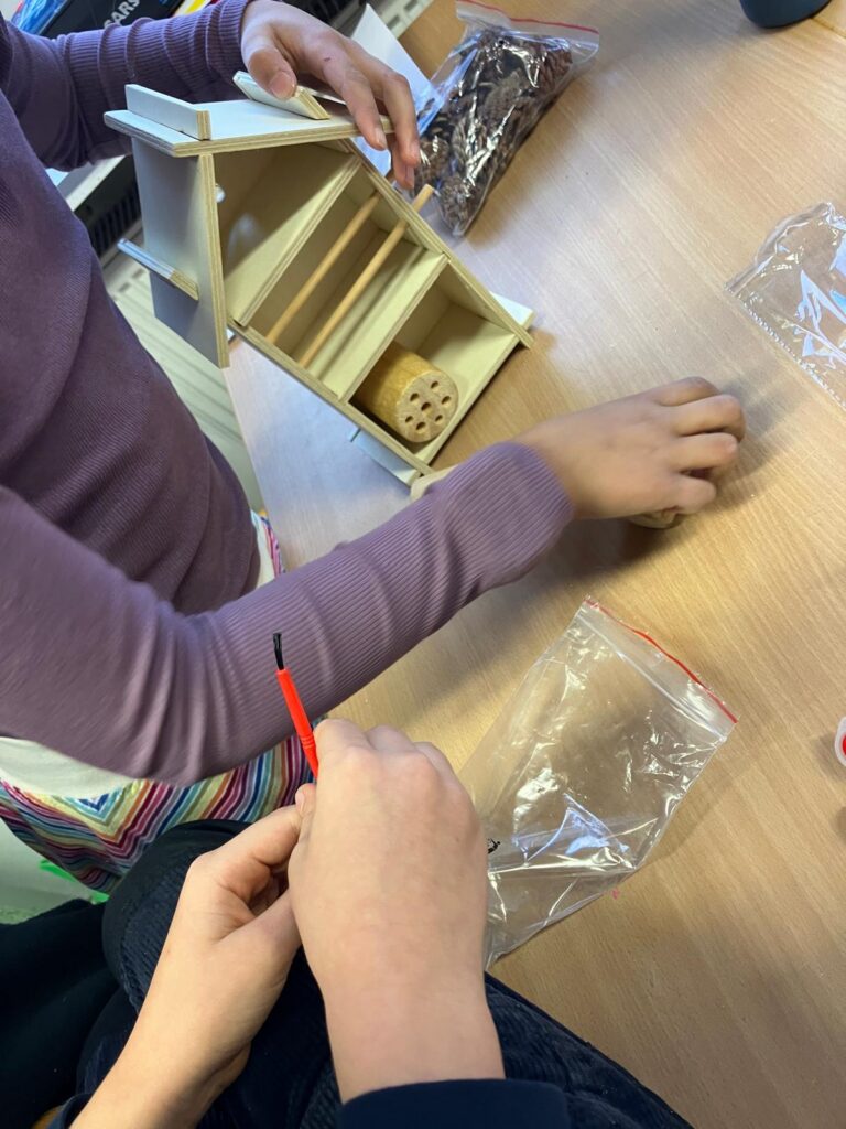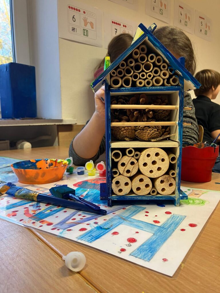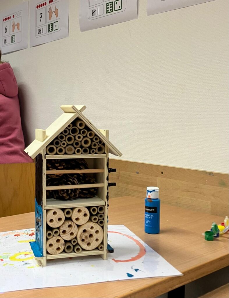„Wir haben in Gruppen alle zusammen die Insektenhotels gebaut. Zuerst musste man die Teile zusammenstecken – das haben wir fast alle ohne Hilfe geschafft. Dann durfte man auswählen, was man in die Insektenhotels füllen möchte. Zum Schluss durften wir die Hotels noch mit wetterfester Farbe anmalen und draußen aufhängen. Das hat viel Spaß gemacht!“ Vielen Dank an alle Teilnehmer*innen von CURACON. Wir sind gespannt, wie viele Gäste in unsere Hotels einziehen werden.